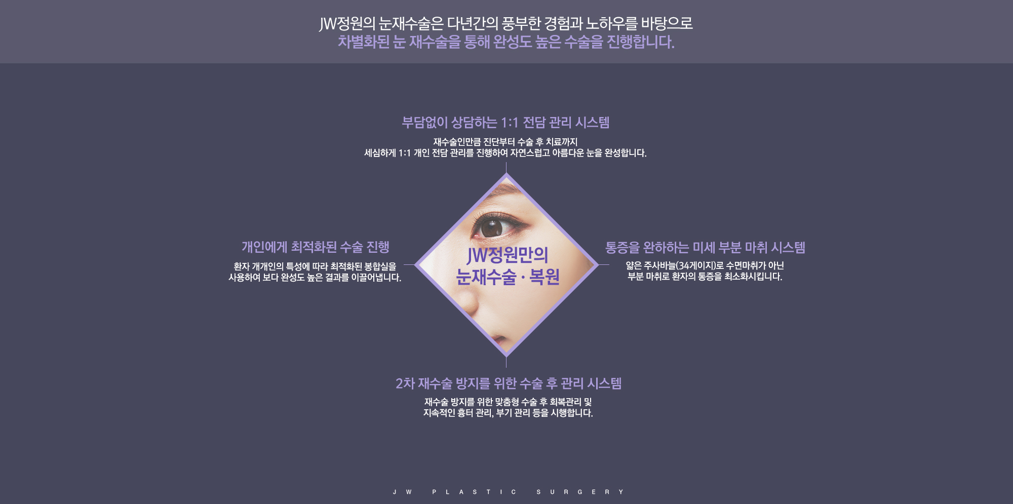 뒷트임 재수술과 복원을 동시에 진행하여 첫 수술 시 나타난 문제점을 해결하면서 눈의 크기는 유지하거나 더 커질 수 있게 합니다. 고난이도의 수술이지만 JW정원의 오랜 수술 노하우로 수준 높은 결과와 만족도를 나타내고 있습니다.